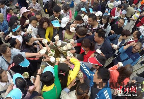 根據(jù)現(xiàn)場描述:5月22日當(dāng)天,道教圣地——欒川老君山的中天門廣場,一塊直徑約5米的“天下 太極豆腐”居中擺放。據(jù)了解,該豆腐是由老君山香客捐贈的谷物制作而成,讓民眾免費品嘗。豆腐為圓形,重量4200斤,用去黃豆2000余斤,上面呈現(xiàn)太極圖并寫著“天下 太極豆腐”。當(dāng)?shù)孛袼讚尪垢礊?ldquo;搶頭福”,開吃兩個多小時即被游客搶光?,F(xiàn)場還配有豆花和調(diào)料汁,讓游客感受欒川豆腐的 魅力。
