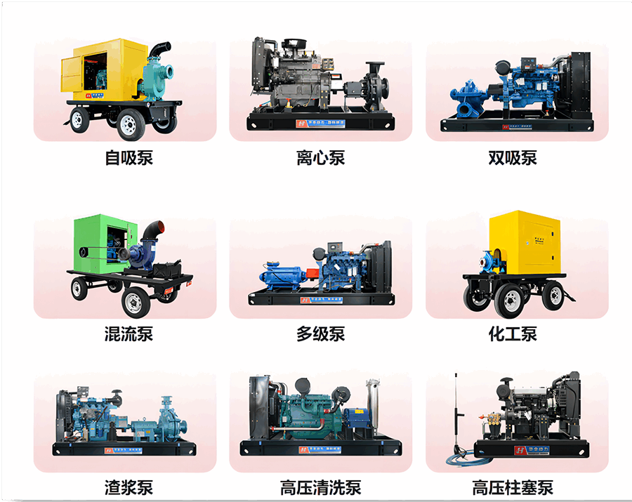 根據(jù)原理、結(jié)構(gòu)的不同,華全電力水泵機(jī)組可以分為自吸泵、離心泵、雙吸泵、混流泵、多級泵、化工泵、渣漿泵、高壓清洗泵、高壓柱塞泵等。