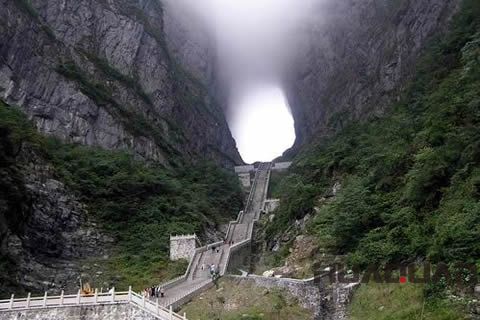 天門山(古稱云夢山),又名玉屏山,坐落于張家界市區以南10公里。公元263年,因山壁崩塌而使山體上部洞開一門,南北相通,吳帝孫休以為吉祥,便賜名天門山。天門主峰海拔1518.6米,屬典型的喀斯特地貌。天門洞則高131.5米,寬57米,深60米,南北對開,終年云蒸霞蔚,歷有天門吐霧、天門靈光、梅花飄雨等三大奇景。如今的天門山,已建設為 森林公園,為 AAAAA旅游景區,景區以觀光游覽為主線,深掘文化內涵,完整的體現了其“神奇”“神秘”“神圣”的大氛圍和主格調,分為天門洞開、天界佛國、丹灶飛煙等十大景觀和天門山索道、通天大道、天門洞、上天梯、云夢仙頂等50余處人文與自然景點。的天門山索道,斜長7455米,上、下站水平高差1279米,成為世界上 長的單線循環脫掛抱索器車廂式索道。