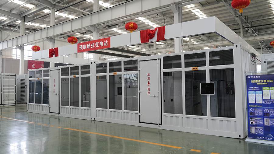 華全電力預制艙變電站,將主變、高壓配電裝置、中壓配電裝置、二次設備等預制在艙內,主要的設計、組裝、配線、調試等工作都在工廠內完成,在現場只需要進行拼接安裝即可完工,極大縮減了建設成本和周期。