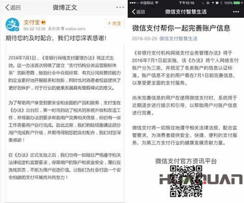 受到央行新規的約束,支付寶、微信支付等網絡支付平臺為了保證用戶在7月1日后依然能順利使用現有支付服務,因此紛紛開始行動。