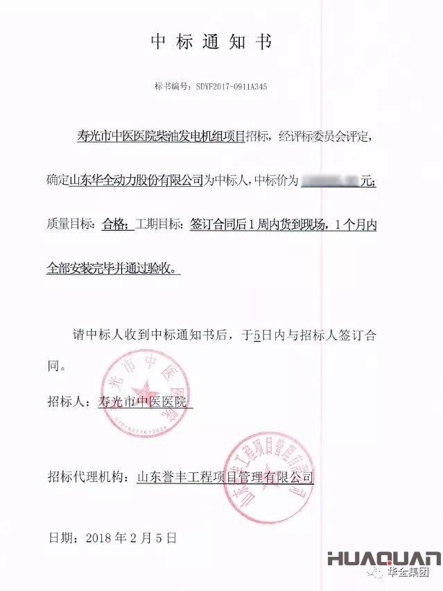 新春好氣象,喜迎開門紅!2018年2月5日,濰坊華全電力有限公司成功中標壽光市中醫醫院柴油發電機組招標項目-成交大型機組訂單