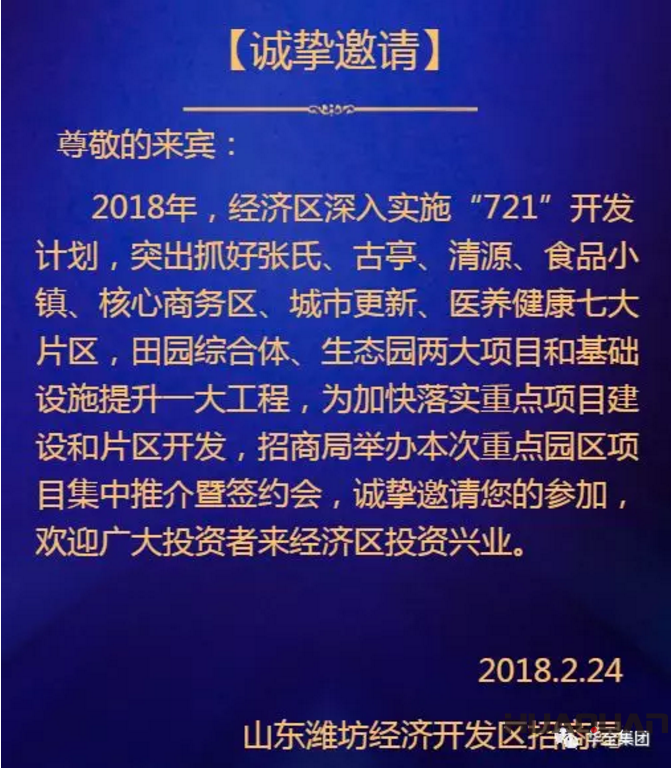 應山東濰坊經濟開發區招商局邀請,出席“濰坊經濟開發區·食品谷重點園區推介暨簽約會”,并在會上成功簽下5000萬投資項目。